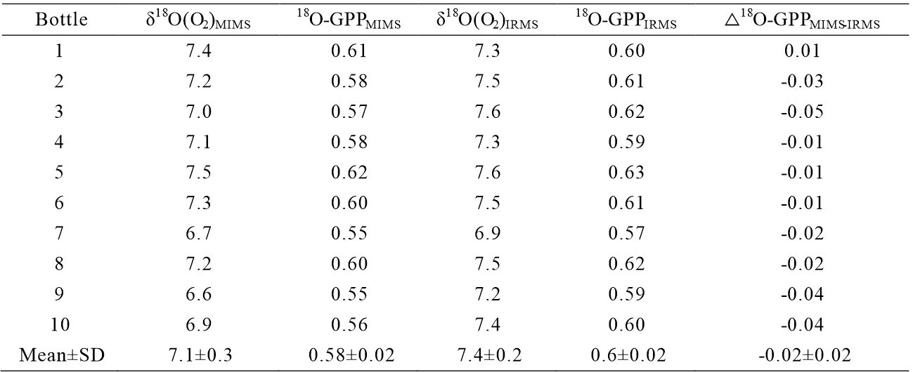 表2 MIMS與IRMS在測(cè)量海洋總初級(jí)生產(chǎn)力時(shí)的數(shù)據(jù)比較